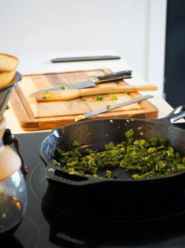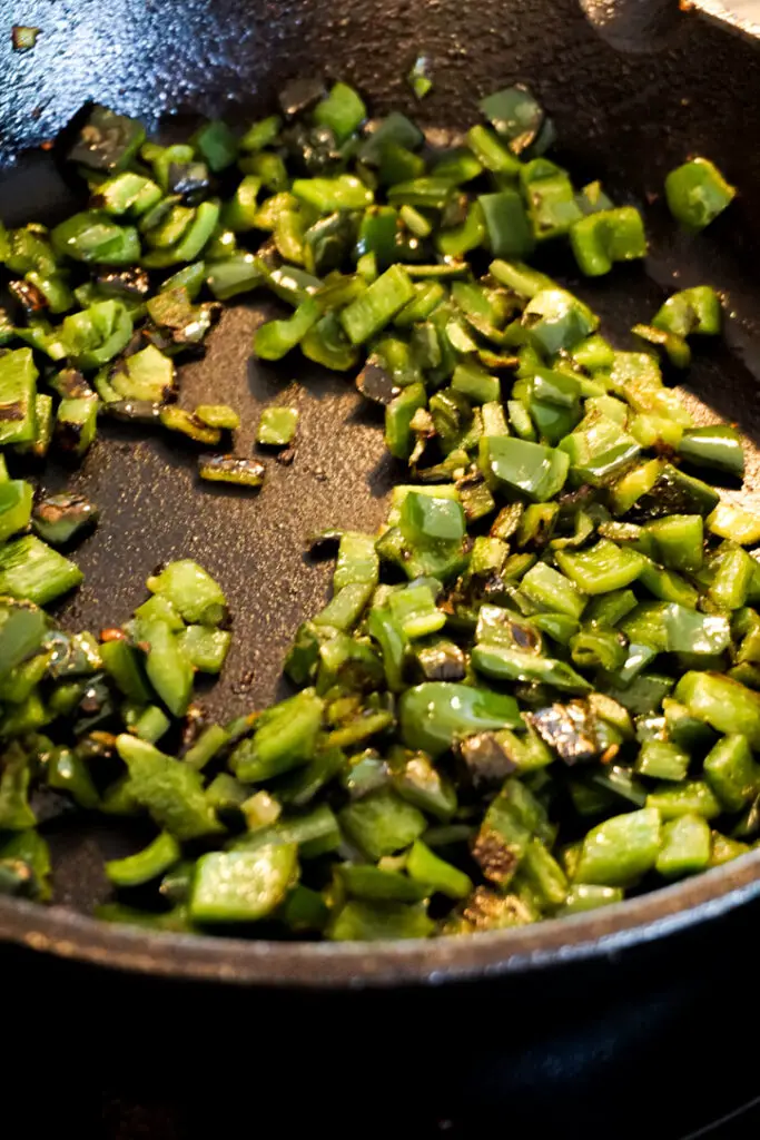 Cast iron is also great for getting a good sear on your food. When cooking the poblano peppers in this recipe, the cast iron will help them get that fire roasted and blistered taste!