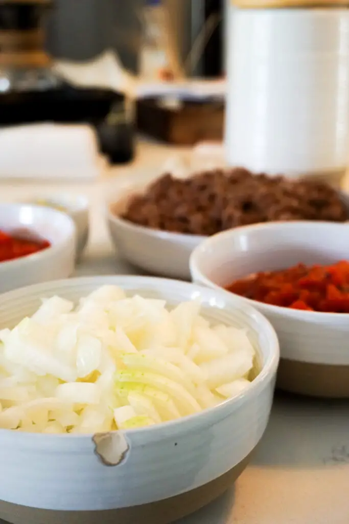 Add to slow cooker - Chop onion, peppers, and garlic.