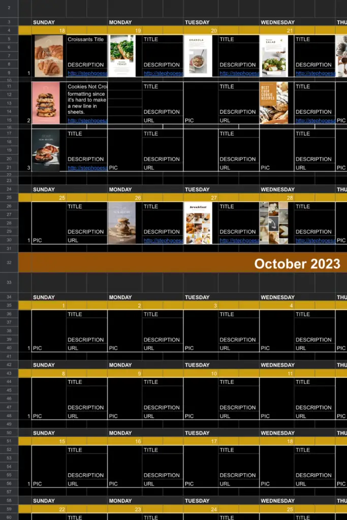 You can also copy and paste the months to plan as far in advance as you’d like. You could even schedule your seasonal content for the next 10 years! This is what I need to help visualize what I will do when I’m creating pins in bulk.