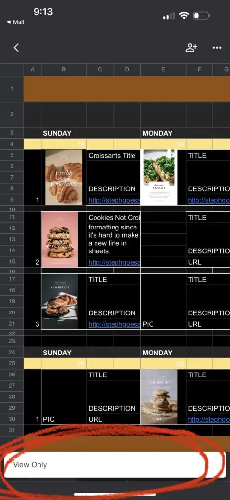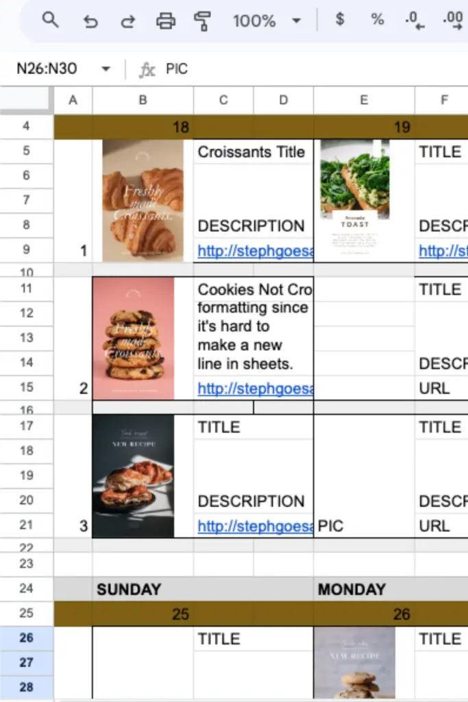However, I needed the visual layout of my pins to help keep me organized. I also wanted to be able to copy and paste the pin title, description, and URL since everything would have to be posted manually. So I came up with a simple spreadsheet to do just that!